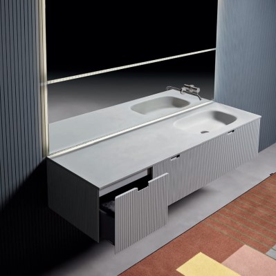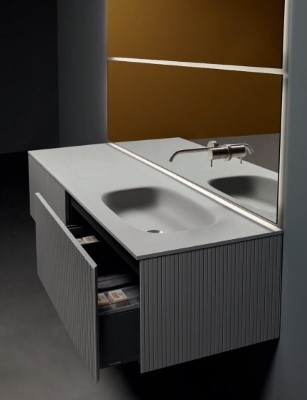 Antoniolupi  Composizione Binario 12.Una collezione di mobili dall’immagine essenziale e dalle linee pulite com’è nello stile di antoniolupi, ma con un segno grafico importante che diventa decoro geometrico per esaltare la matericità delle superfici e valorizzare il volume dei contenitori. Linee parallele come binari incidono i frontali dell’anta e dei fianchi, conferendo tridimensionalità alla superficie e vestendo il mobile con una “plissettatura” che ne alleggerisce visivamente l’immagine. Distanziate tra loro di 3 mm in Binario 03 e 12 mm in Binario 12, le fresature scandiscono lo sviluppo longitudinale del contenitore, opponendo una traccia verticale molto fitta che “misura” la proporzione dell’anta, arricchendo di significato l’intero progetto