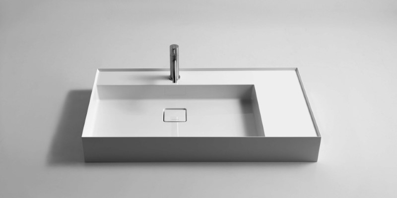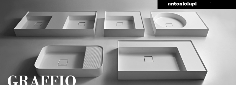 Antoniolupi Lavabo Graffio. Nuovi equilibri proporzionali e formali nati dall’intersezione di quadrati, cerchi e rettangoli sapientemente dimensionati, alternanza di parti lisce e aree in rilievo per superfici che acquisiscono tridimensionalità inaspettate. Graffio è una collezione di 5 diversi lavabi soprapiano o a parete realizzati in Ceramilux. L’estrema sottigliezza del bordo rimanda all’immagine di una linea tracciata per definire un perimetro che racchiude al suo interno tutte le funzioni del lavabo: il bacino, il piano d’appoggio sul quale installare il rubinetto e un piano supplementare di servizio.