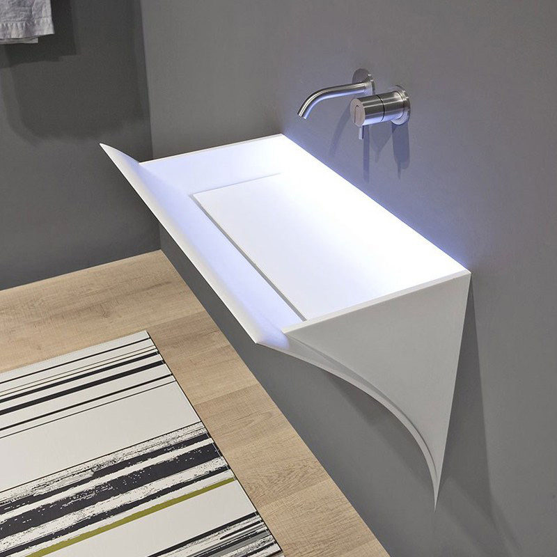 Antoniolupi Lavabo Strappo. Il design riprende alla lettera il suo none, strappo: si presenta come una squarcio, o strappo, sulla parete, e da essa esce fuori il lavabo. Timido e minimale, è un lavabo che esce fuori dal muro, ma facendone parte quasi integralmente. Costruito in Corian, può essere stuccato e colorato dello stesso colore della parete, creando un’ambientazione suggestiva e accattivante, senza sfigurare l’ambiente arredo bagno. Proposto nella versione col LED (rgb), accrescendo l’atmosfera e valorizzando il fluido movimento, oppure senza illuminazione LED.