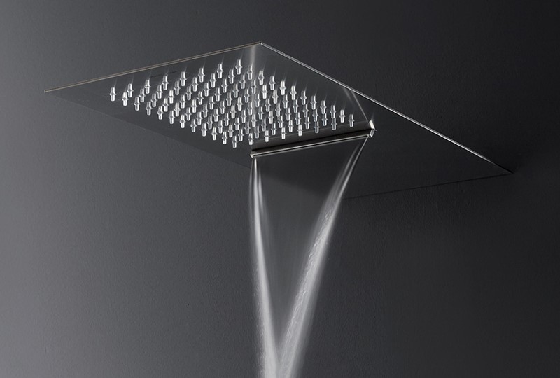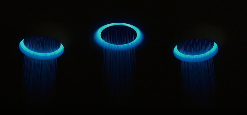 Antoniolupi Soffione Meteo_OUT. L’ultima evoluzione della collezione si soffioni Meteo indaga il tema del mistero, della sorpresa, della capacità della tecnologia di scomparire per lasciare spazio all’emozione. L’acqua cade direttamente dal soffitto, la luce colorata ne delimita la proiezione generando un fascino di infinite vibrazioni e riflessi cromatici. La sensazione di benessere è totale e coinvolge tutti i sensi.