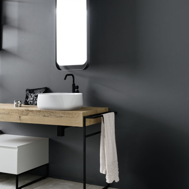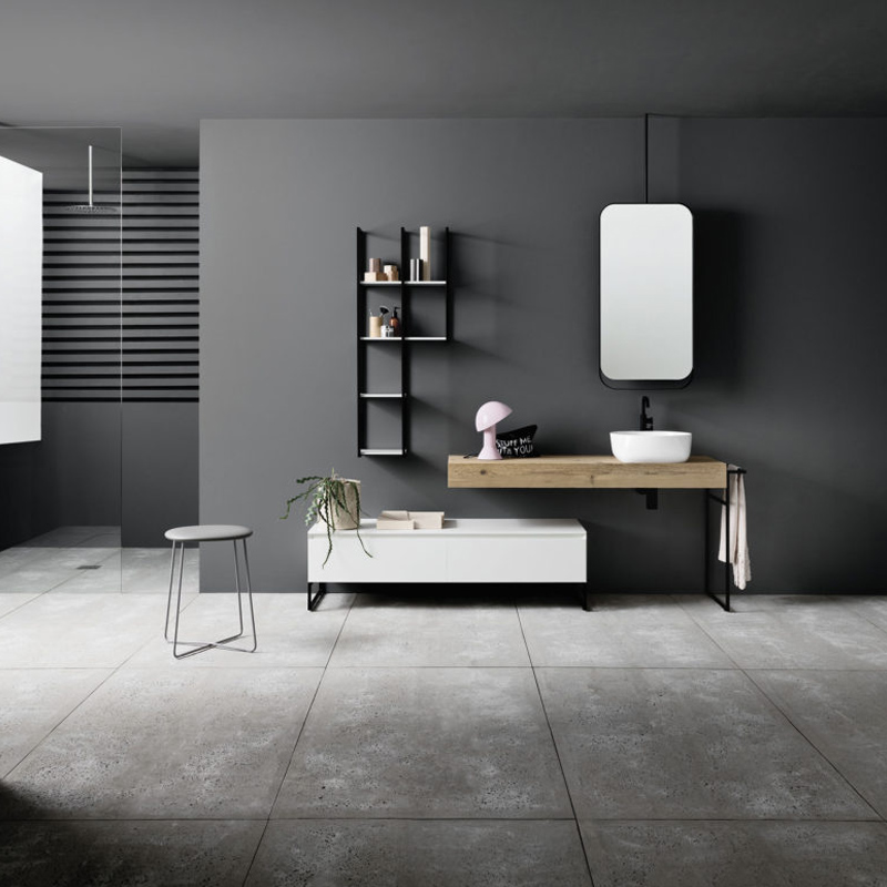 Arbi  Composizione Code 17. Minimale, moderna ed estremamente elegante. La casa madre, Arbi, ha voluto creare con questa composizione il giusto mix tra vintane, minimalismo ed eleganza, facendo della composizione una vera e proprio opera d’arte, rispecchiano tutti i canoni della moda moderna. Il lavabo Panier, in colorazione bianco lucido, poggia su di un piano top sospeso di ben 12,2 Cm di spessore, ed è disponibile in ben 10 finiture legno differenti. Attaccato al top, troviamo una gamba in alluminio porta salviette, disponibile in 3 colorazioni diverse. Sotto possiamo trovare una base con 2 cassettoni contenitivi  di 140,3 Cm di larghezza, esclusivamente disponibile laccato bianco opaco. Pensile in alluminio con vari ripiani, anch’esso disponibile in 3 colorazioni. Specchiera, modello Forma, direzionale in metallo nero, con asta regolabile in altezza.
