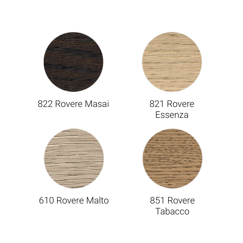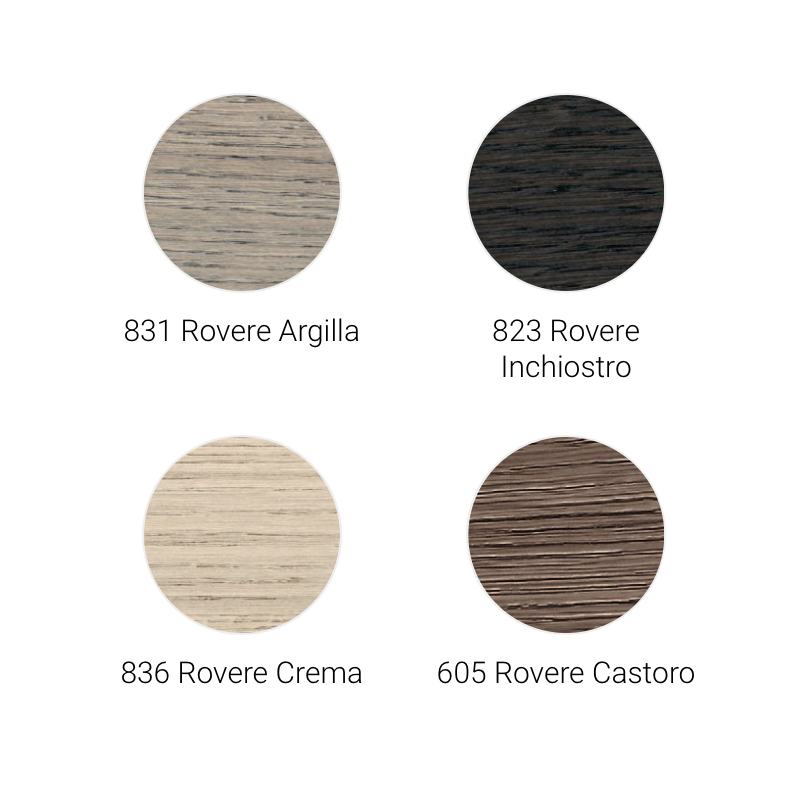 Rovere Argilla, Rovere Inchiostro, Rovere Masai, Rovere Essenza, Rovere Malto, Rovere Tabacco, Rovere Crema, Rovere Castoro, Eucalipto Opaco, Eucalipto Lucido