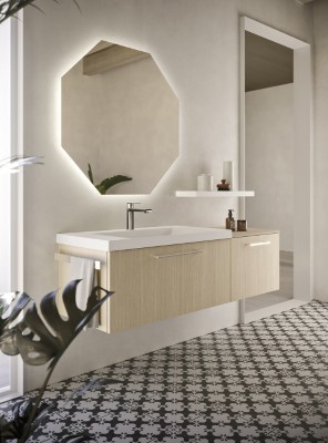 Arbi  Composizione Home 11 L.120 finitura legno .  Ho.Me Plus è un’inedita collezione firmata Arbi Arredobagno che raccoglie una vasta gamma di finiture in melaminico termostrutturato dalle venature naturali, ai colori classici o di tendenza. Trasversale nello stile, ho.me plus è disponibile in due varianti: una con anta con maniglia, l’altra con presa maniglia “J” integrata. Flessibile nell’ambientazione grazie alla scelta fra tre profondità e diverse larghezze, la collezione è arricchita dalla versione curva, che propone basi dalle linee morbide per soddisfare anche le esigenze di ottimizzazione degli spazi più ristretti.