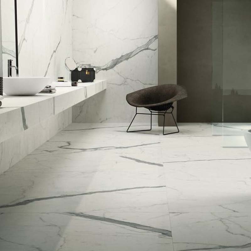 Graniti Fiandre Marble Calacatta Statuario (Prima Scelta) 60/120×60 Cm. Gres porcellanato ad effetto marmo. La tonalità risulta una delle più chiare della linea, mentre la croma è sul biancastro con striature nere abbastanza nette. L’effetto marmo riporta in tutto e per tutto il marmo calafata statuario esattamente come si trova in natura. L’aziende lo propone in due differenti formati moderni, ovvero 60×60 e 60×120 Cm. Molto adattabile, viene utilizzato indifferentemente sia in campo commerciale, e sia in campo residenziali. Elegante e raffinato, la sua superficie semilucida riesce a garantire un effetto moderno, minimale ed alla moda. La serie Marble si costituisce di 10 colori differenti: Bianco, Calacatta Statuario, Calacatta Elite, Glam, Nero, Noble, Pietra, Taxos, Quarzo, White.