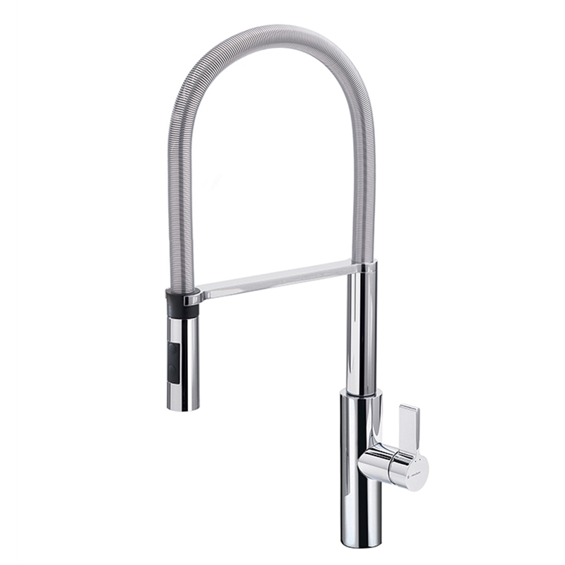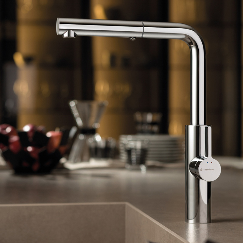 Newform  Rubinetto Cucina Libera. L’alta qualità e funzionalità sono il segno distintivo di questa serie di casa Newforma. Linee morbide ma ben definite, costruiscono più di un semplice rubinetto, ma un vero e proprio complemento d’arredo per la cucina. Proposto in due versioni, con molla girevole e orientabile e con bocca girevole e doccia estraibile a doppio getto. Entrambi i rubinetti sono disponibili in 3 colorazioni differenti: cromo , cromo/bianco e cromo/nero.